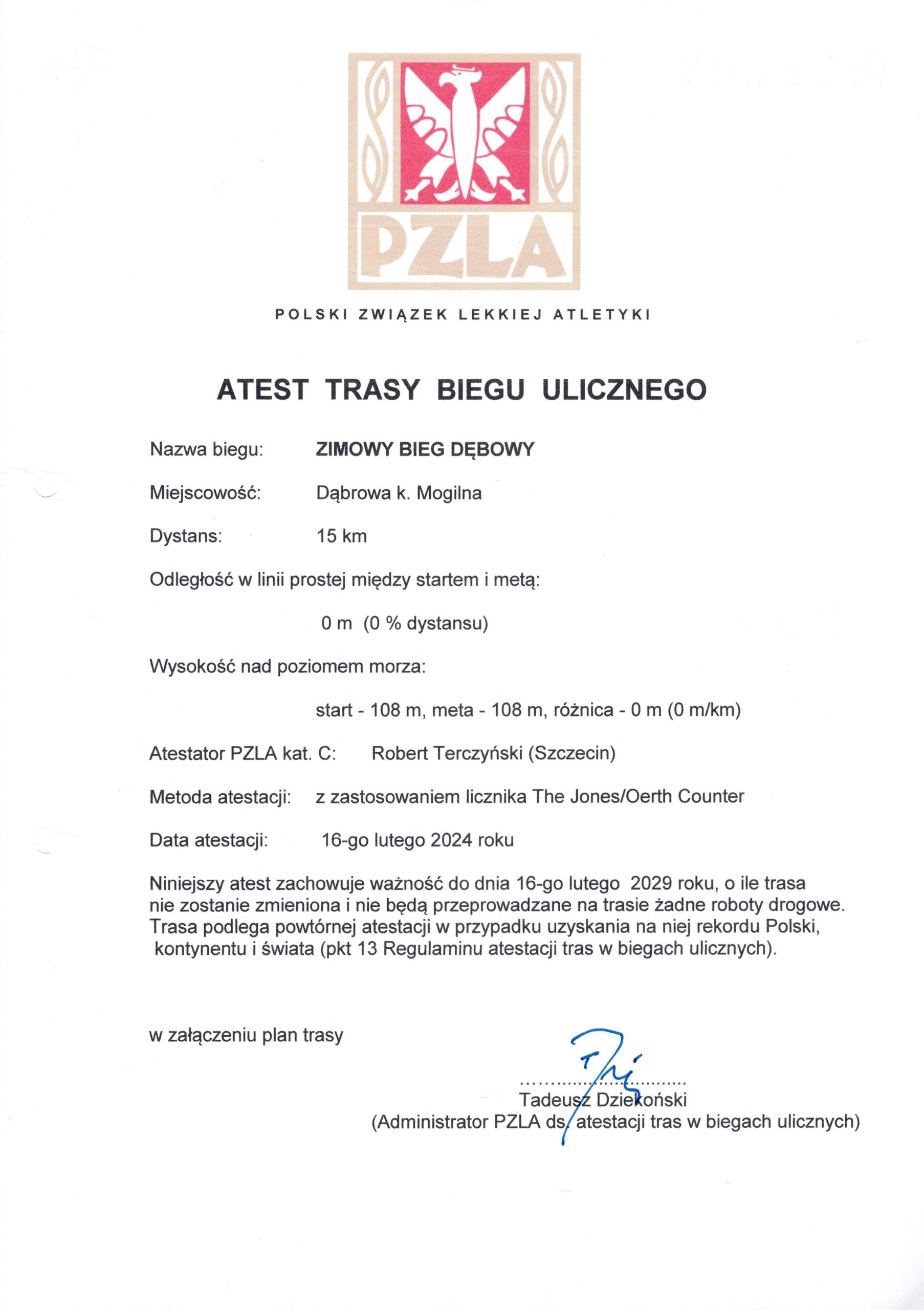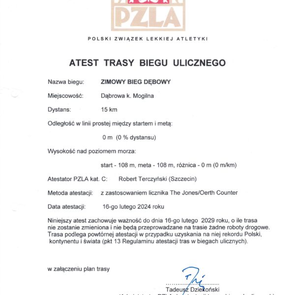 Trasa zawodów posiada atest Polskiego Związku Lekkiej Atletyki (PZLA), a jej nawierzchnia jest asfaltowa. Dla wygody uczestników oznaczenia trasy umieszczono co kilometr w formie znaków pionowych. Pomiar czasu będzie prowadzony w systemie elektronicznym, zapewniającym dokładność i rzetelność wyników. Start i meta zlokalizowane są przy boisku Zespołu Szkół w Dąbrowie, na ul. Sportowej.